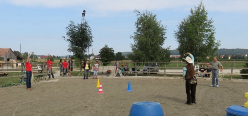 | Mit Schulpferd können nur regelmäßige Reiter der Riedmühl-Ranch teilnehmen, alle anderen benötigen zur Sicherheit ein Sichtungsreiten. |