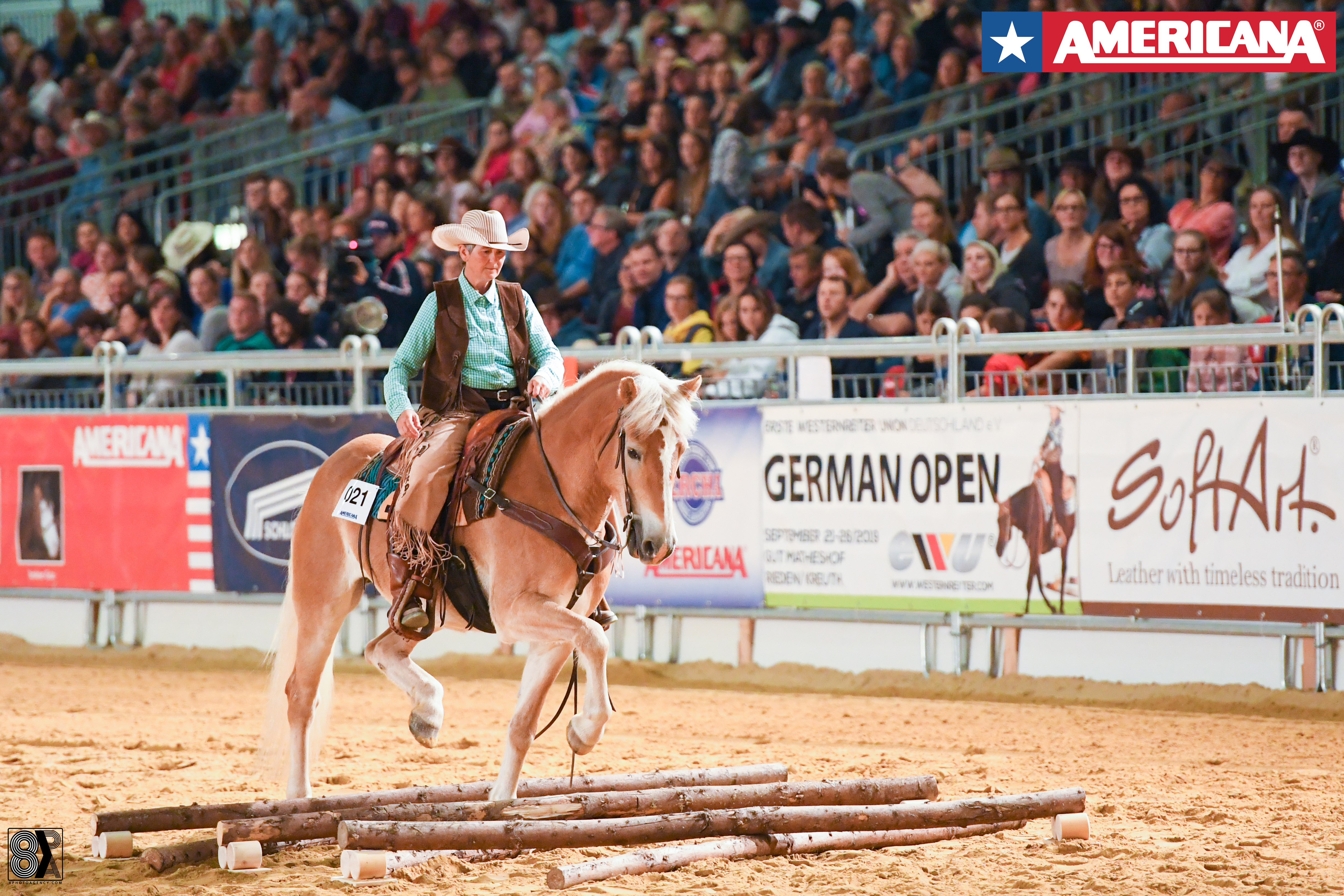 | Sabrina beginnt den Kurs mit Bodenarbeit, je nach Alter & Ausbildung des Pferdes können die Hindernissen im Lauf des Kurses auch geritten werden. |